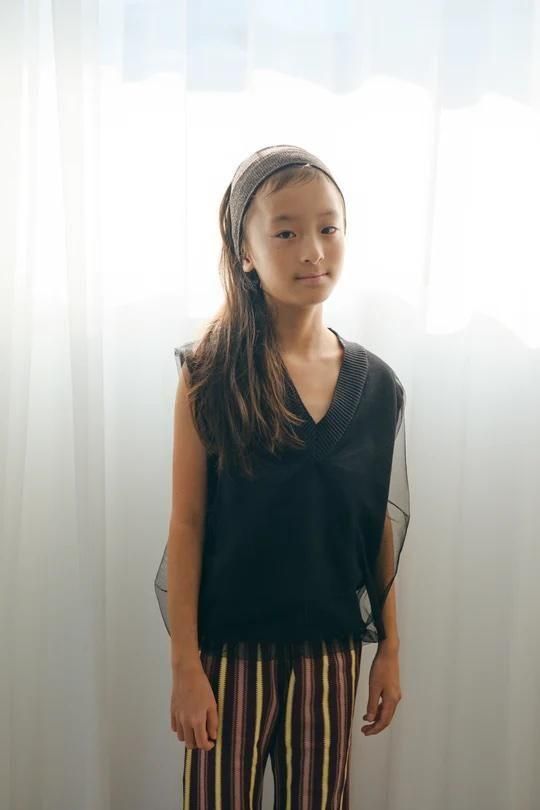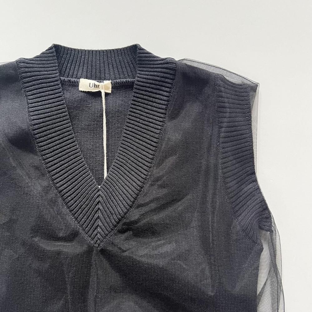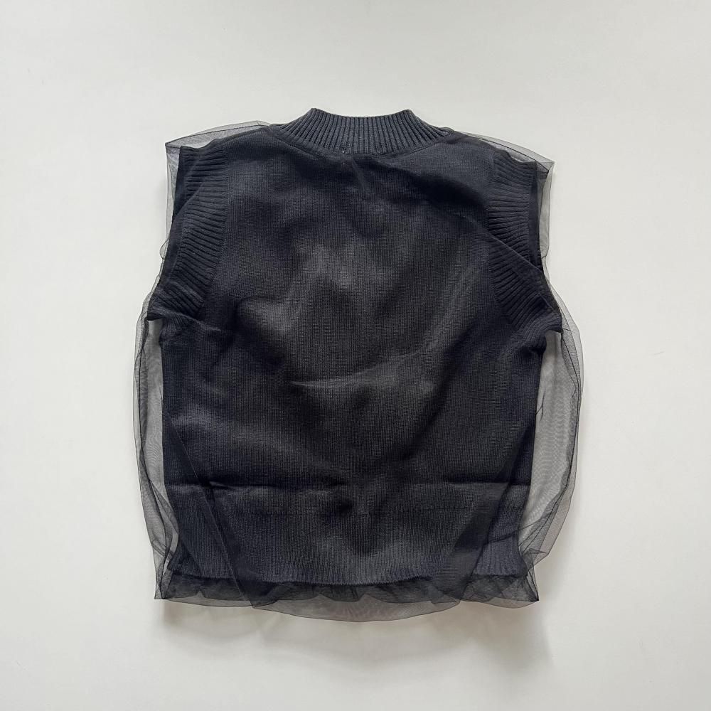 ニットにリサイクルペットボトルが原料のチュール素材を重ねた、チャーミングなベスト。ジャストサイズで着ても、オーバーサイズに着てもかわいいアイテムです。