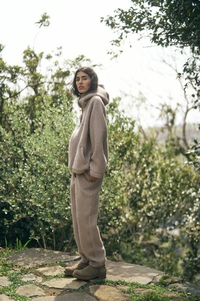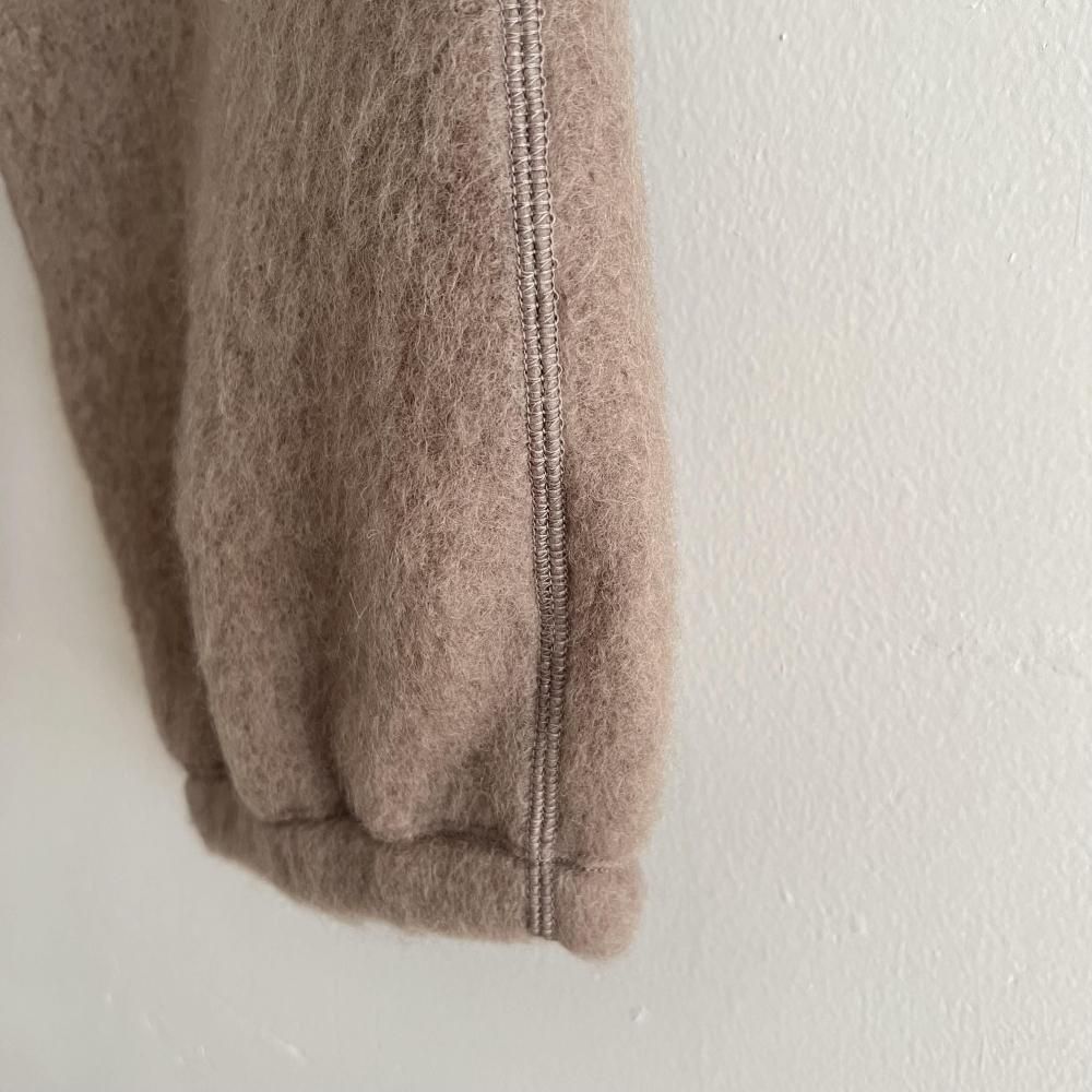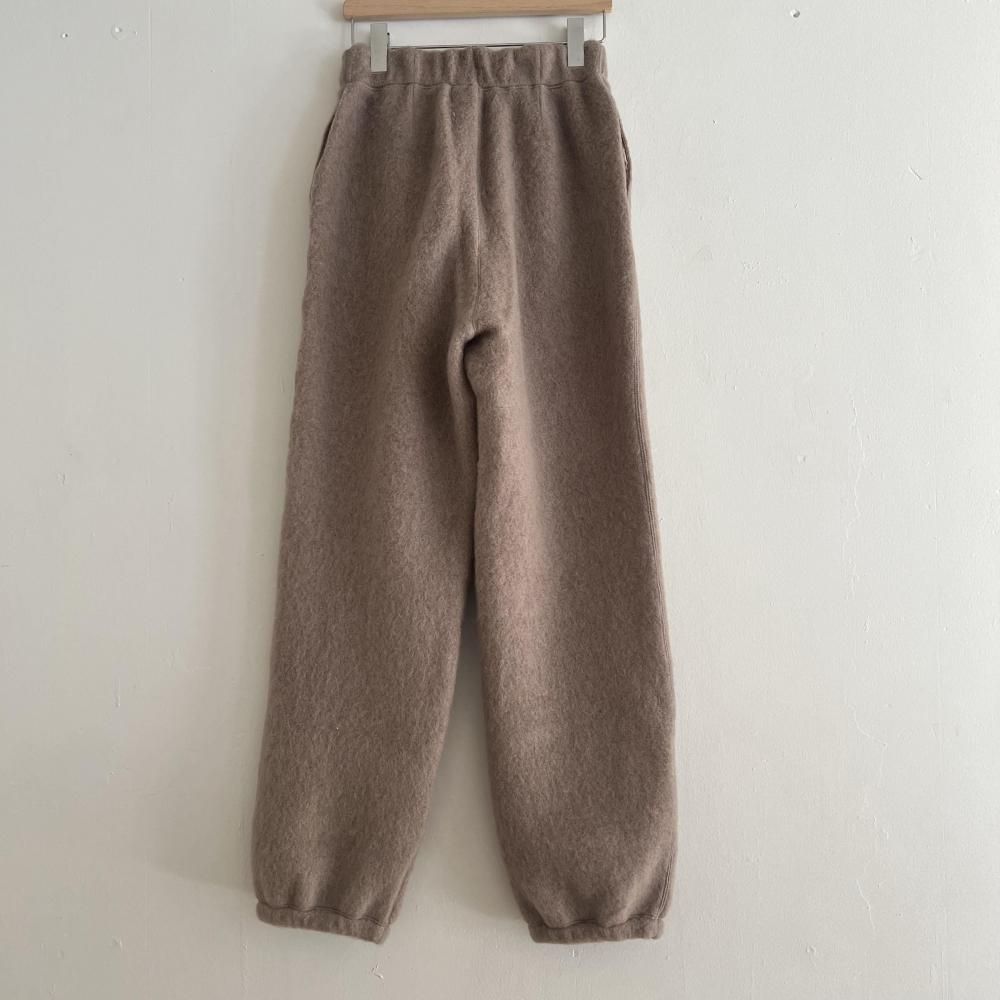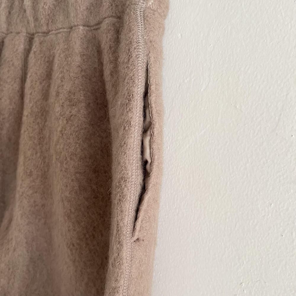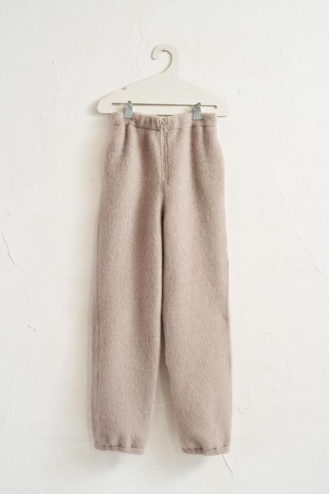 軽くふんわり厚手に織り上げたパイルジャージーに起毛加工を施し、シャギーの表面感のある素材です。パイルが空気を含み、ウールならではの保温性でとても暖か。ジップアップのウエストに、太すぎずすっきりとしたシルエットがポイント。