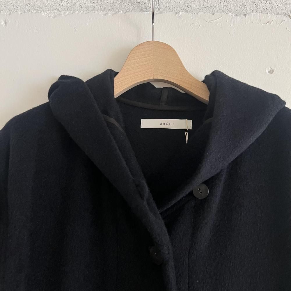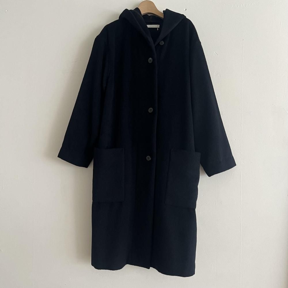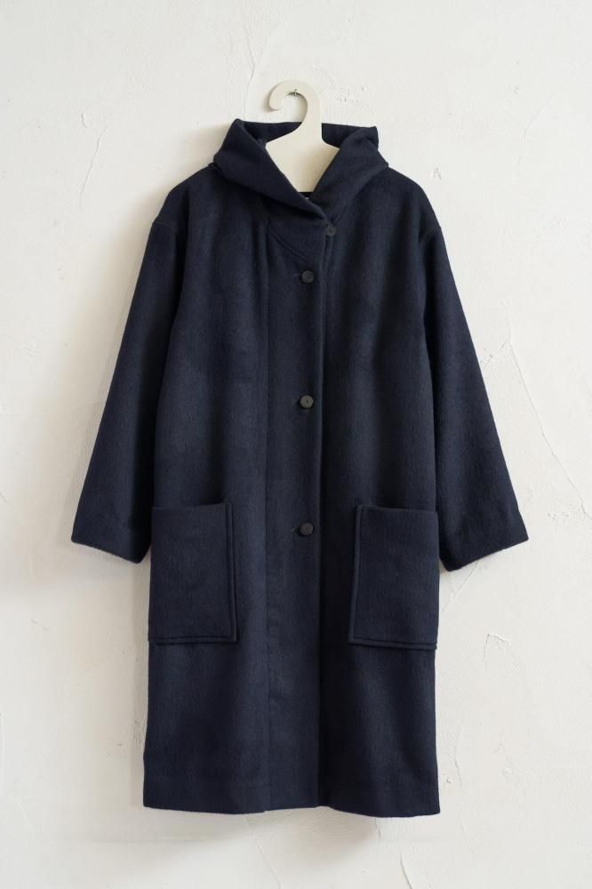 とても柔らかで軽く、上質な素材のミドルコート。フードは首周りを暖かく、程よくカジュアルダウンした印象に。袖も身幅もすっきり見えるようにし、ゆとりも確保。中にも着込め、とても暖か。