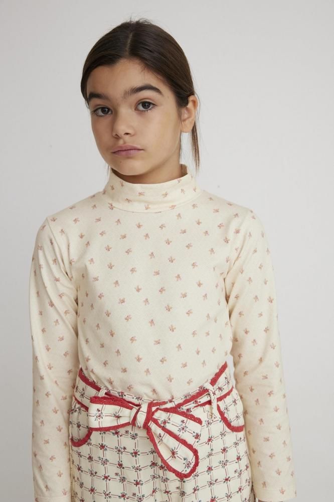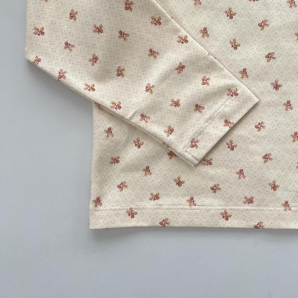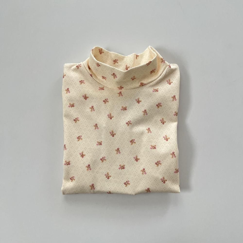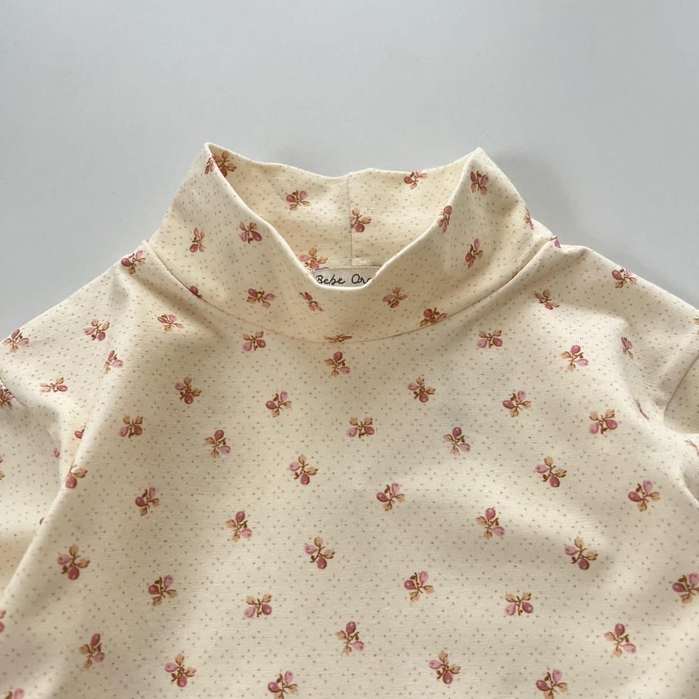小さなドットと花が前面にプリントされたハイネックカットソー。