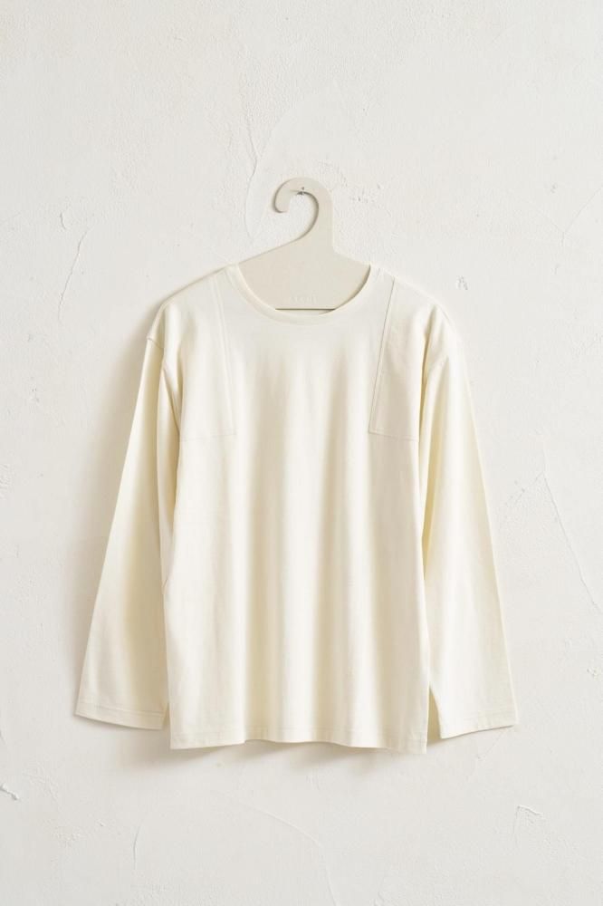袖と肩にほどよいゆとりを持たせながら、裾まわりはすっきりと整え、シルエットにメリハリを出しました。肩には同素材のパッチを配し、さりげないアクセントに。