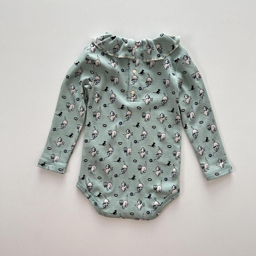 襟に小さなリボンとフリルカラーがついたonesie。
