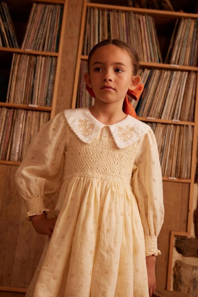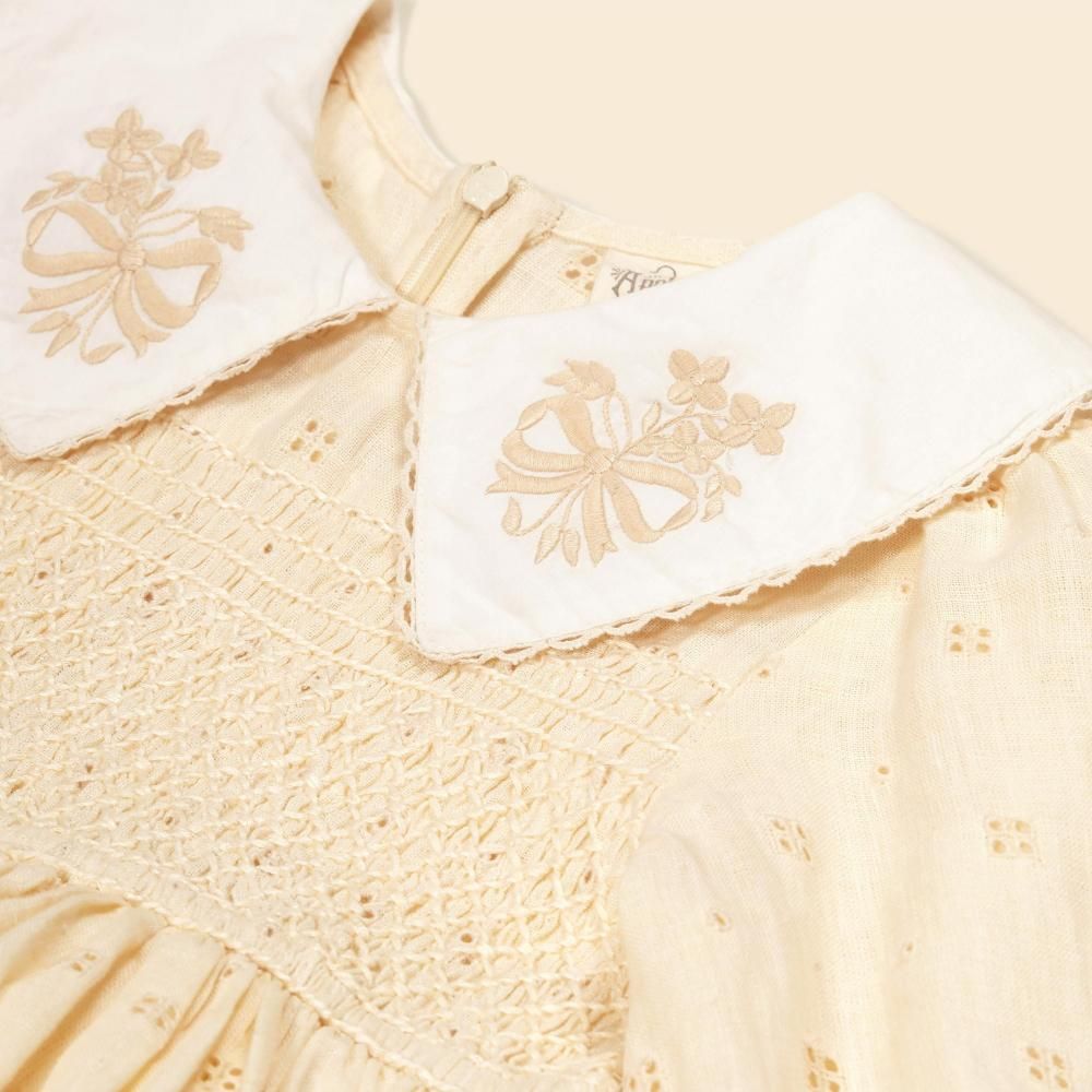 ふんわりとしたパフスリーブにスモッキングカフス、胸元のスモッキング、手仕上げ、コントラストカラーの可愛らしいリボン刺繍が施されています。背中は見えないジッパー開閉式。