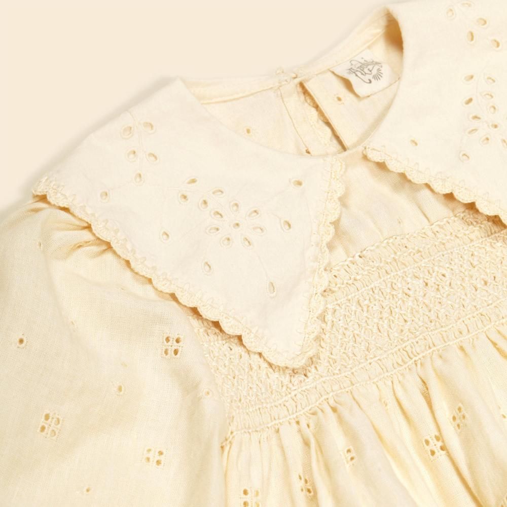 ふんわりとしたパフスリーブと胸元の繊細な手作業によるスモッキングが、優しいシルエットを生み出します。手作業で施されたスモッキングの袖口と、存在感あるカラーに施されたスカラップ編みのクロシェトリムが特徴です。