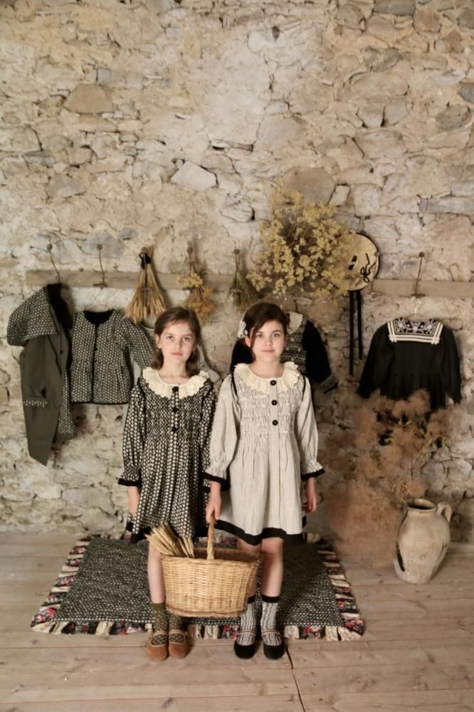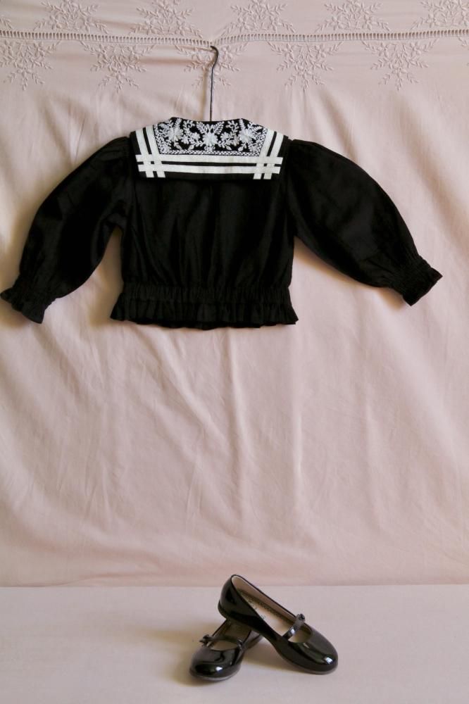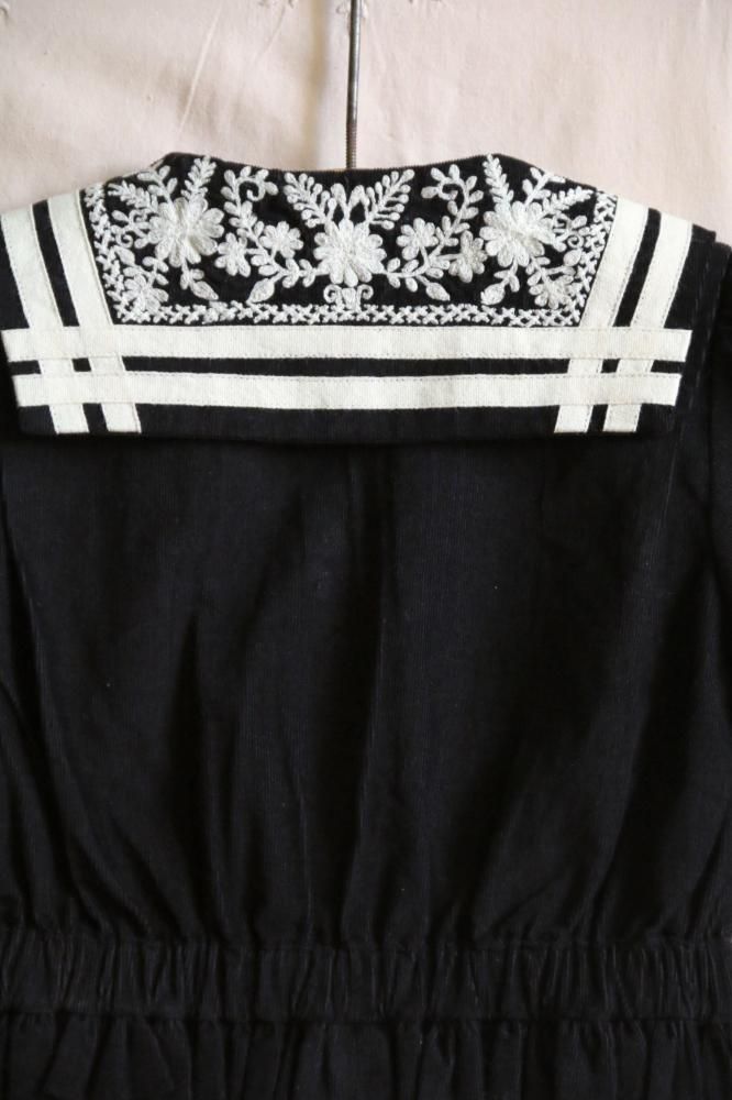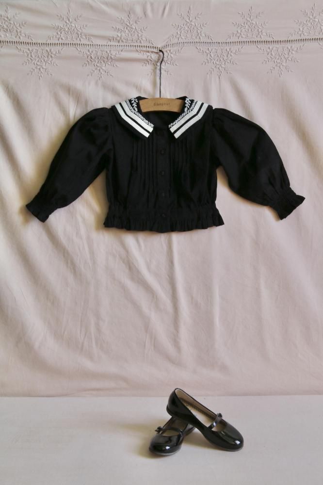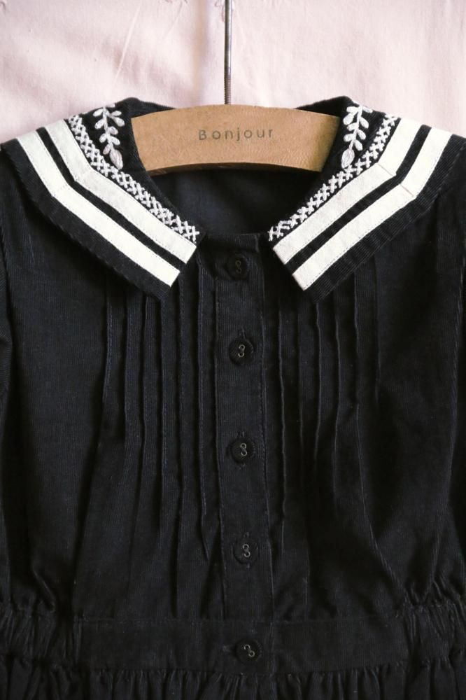 シックな黒のムードに白いラインと刺繍やピンタック、ボリューム袖などのバランスがBONJOURならではの可愛さです。