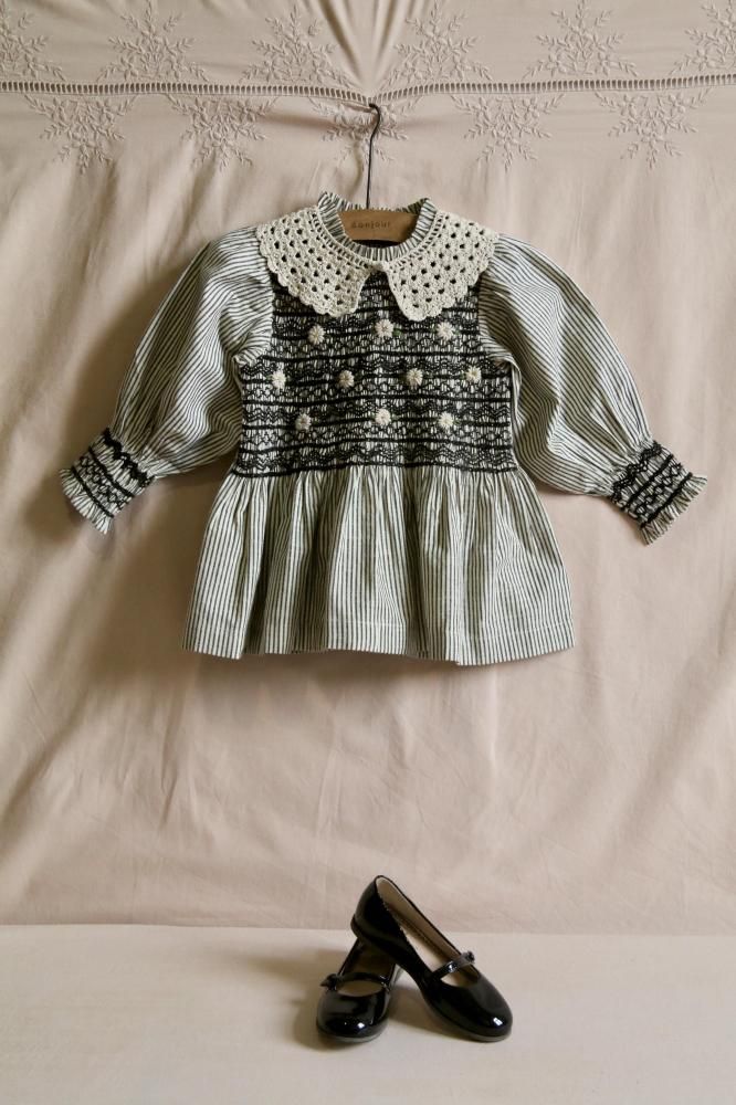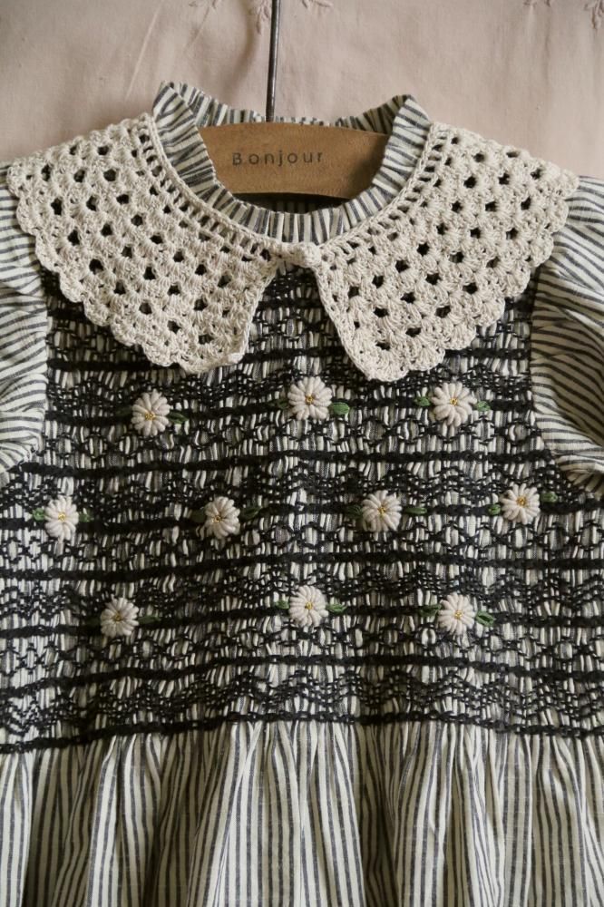 定番のhandsmock blouseに今シーズンは取り外し可能なクロッシェ編みの襟付き。