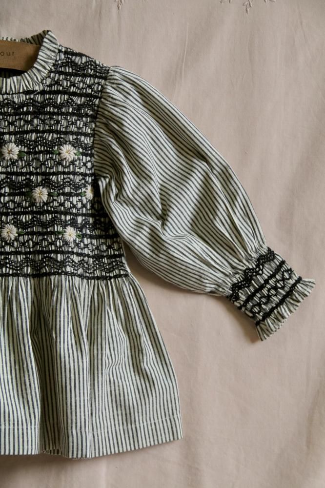 モノトーンのストライプベースにフロントにはふんだんに刺繍が施されています。