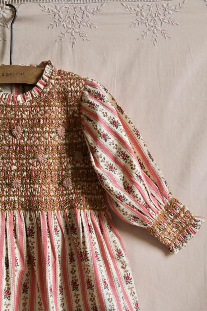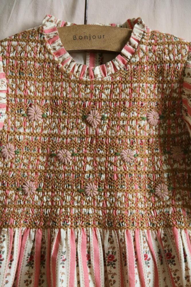 ストライプと花柄プリントにフロントにはふんだんに刺繍が施されています。