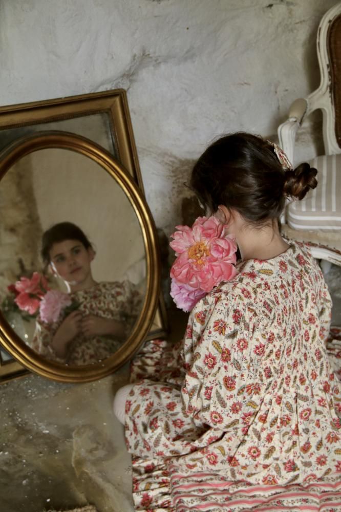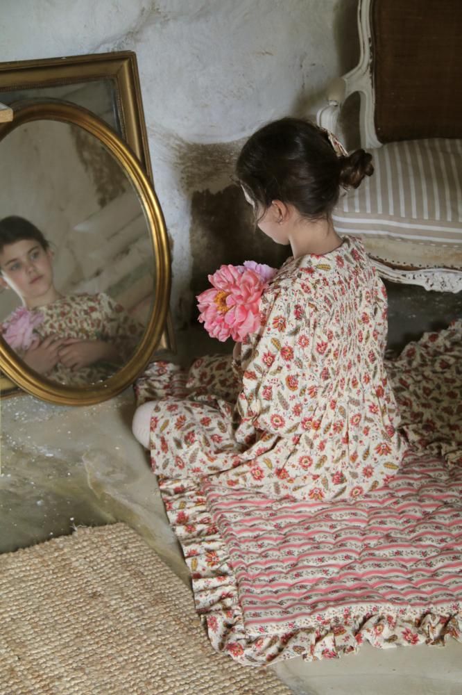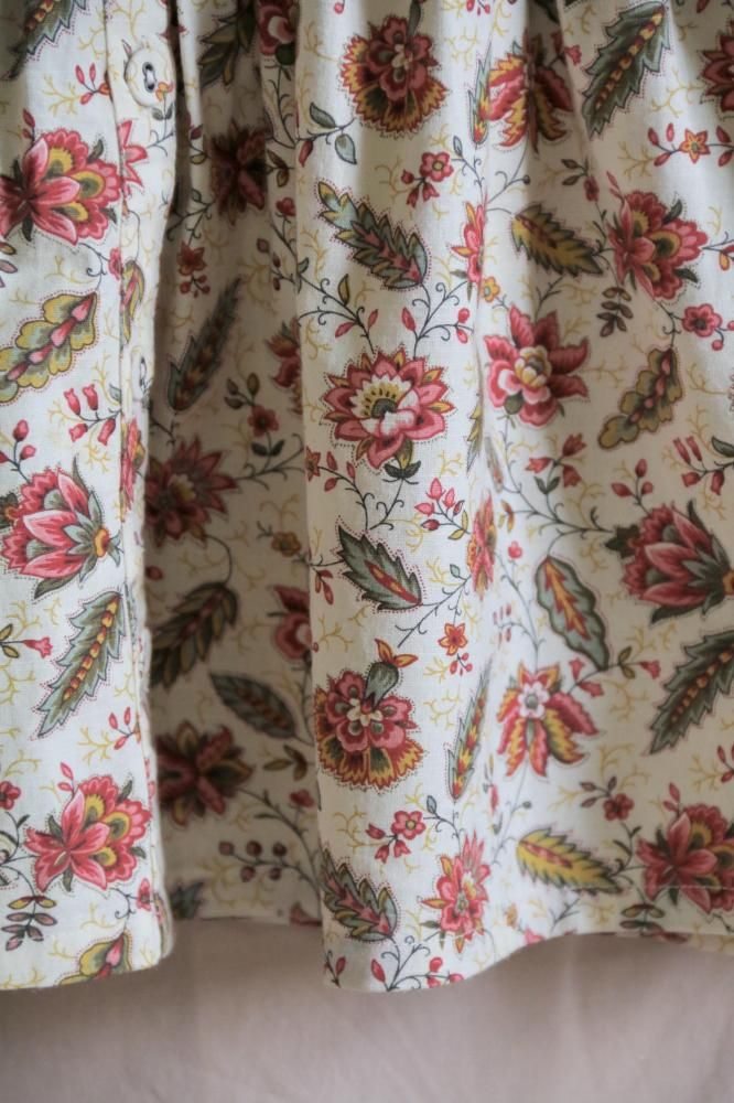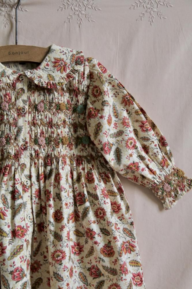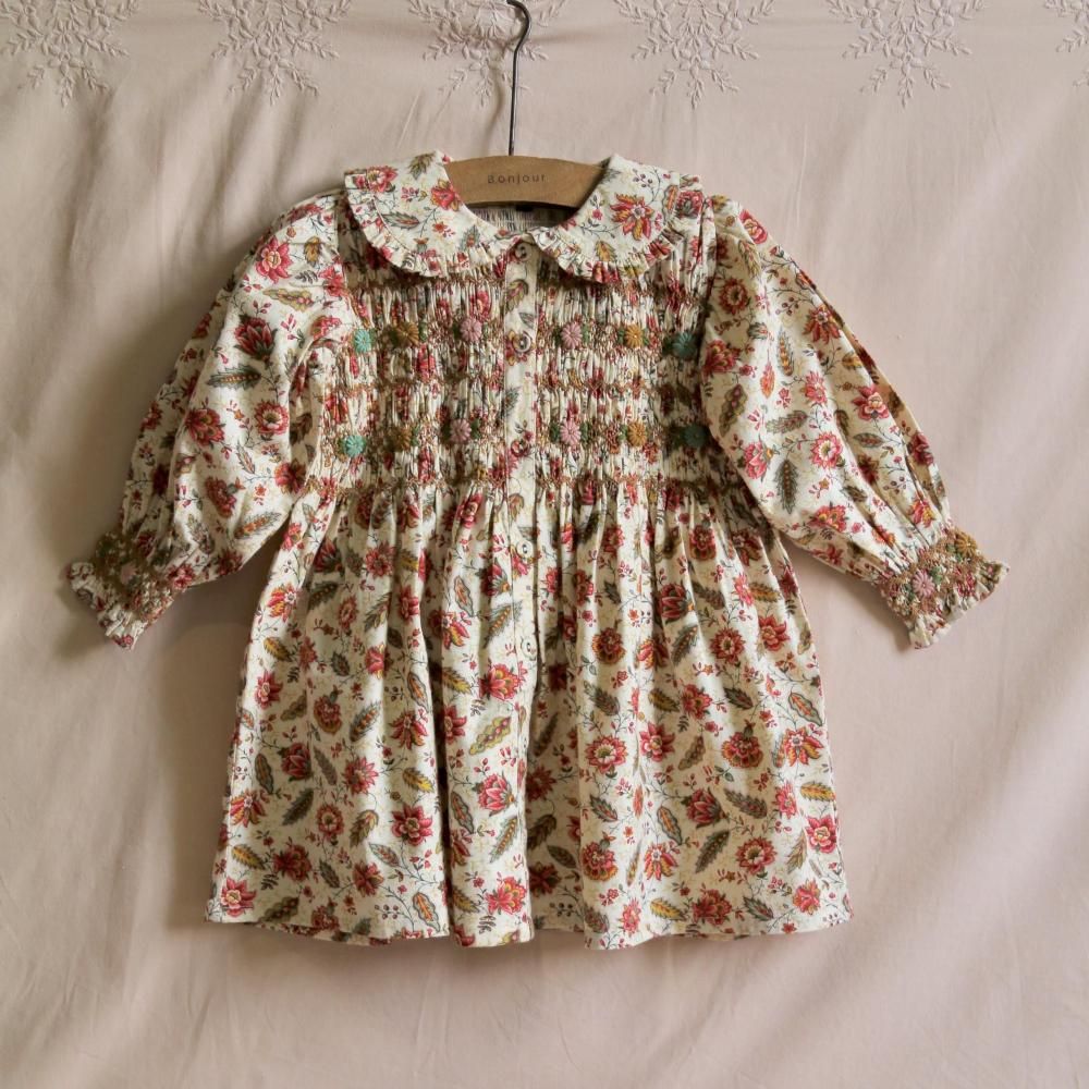 丸襟にバルーンスリーブ、胸元にはスモッキングとカラフルな花の刺繍が施されたワンピース。