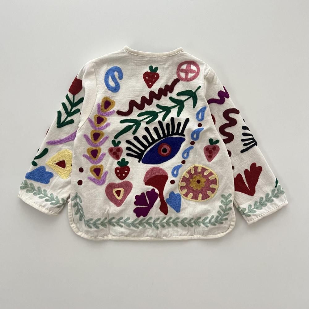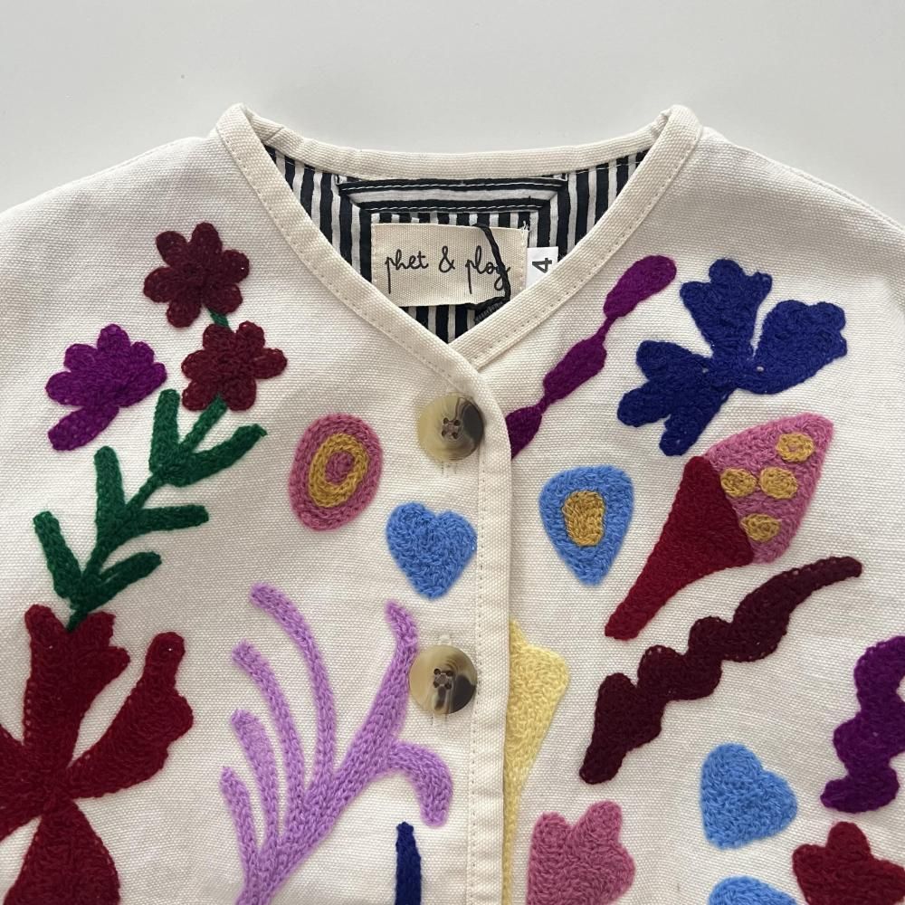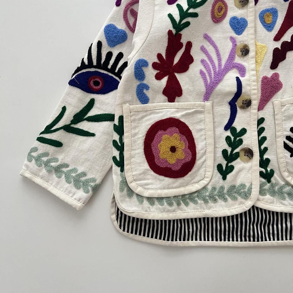 ノーカラーで様々なモチーフがウールでカラフルに刺繍されたジャケット。