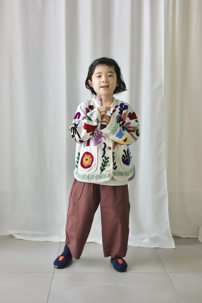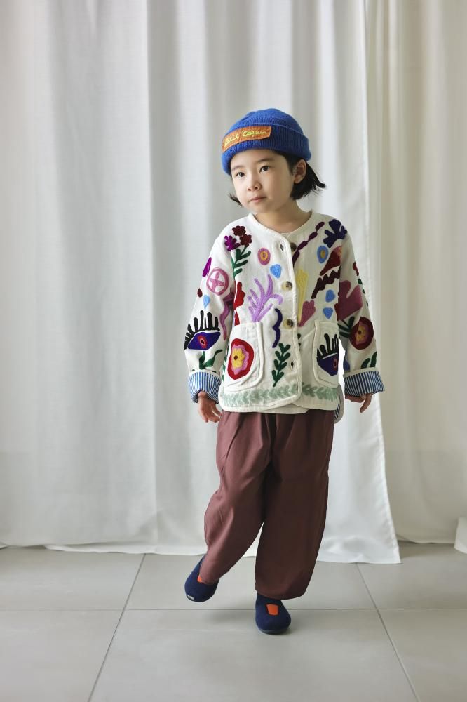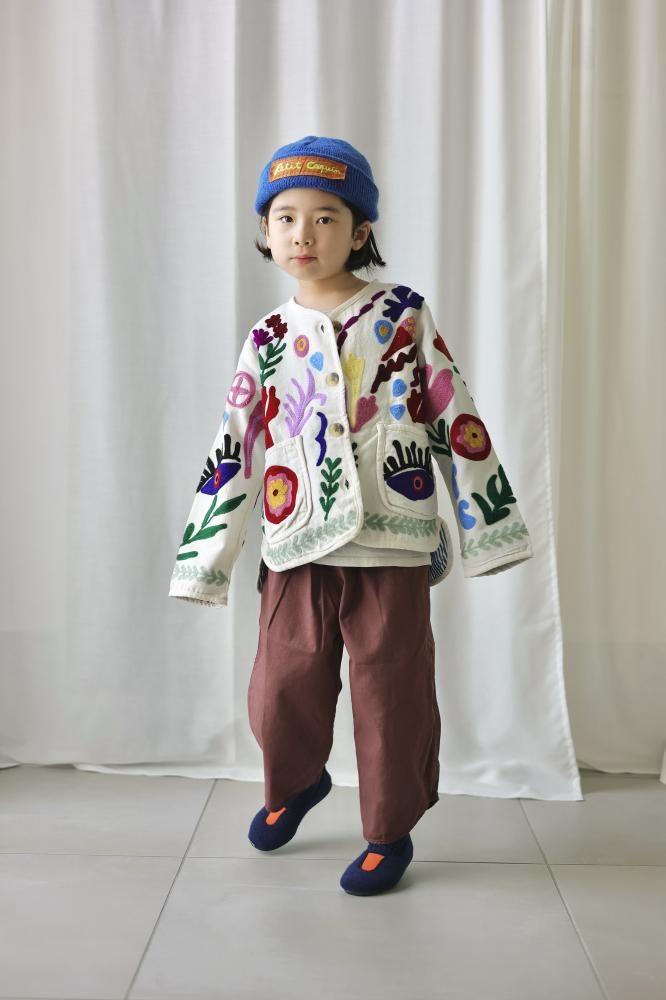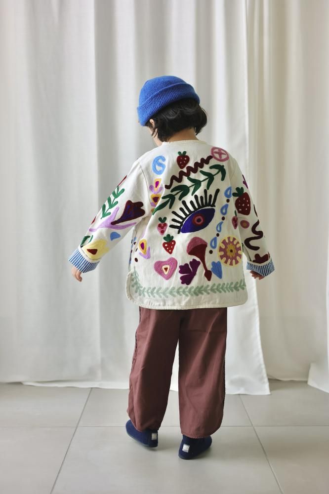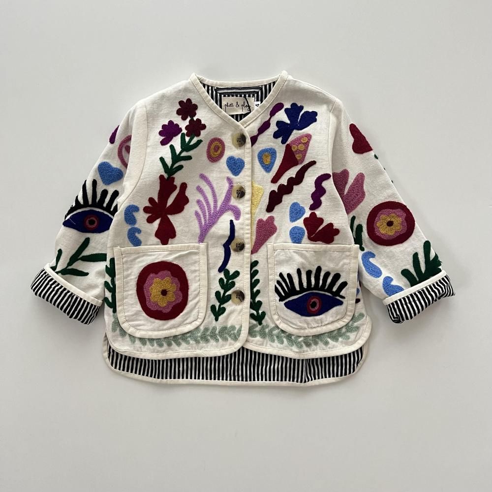 ノーカラーで様々なモチーフがウールでカラフルに刺繍されたジャケット。